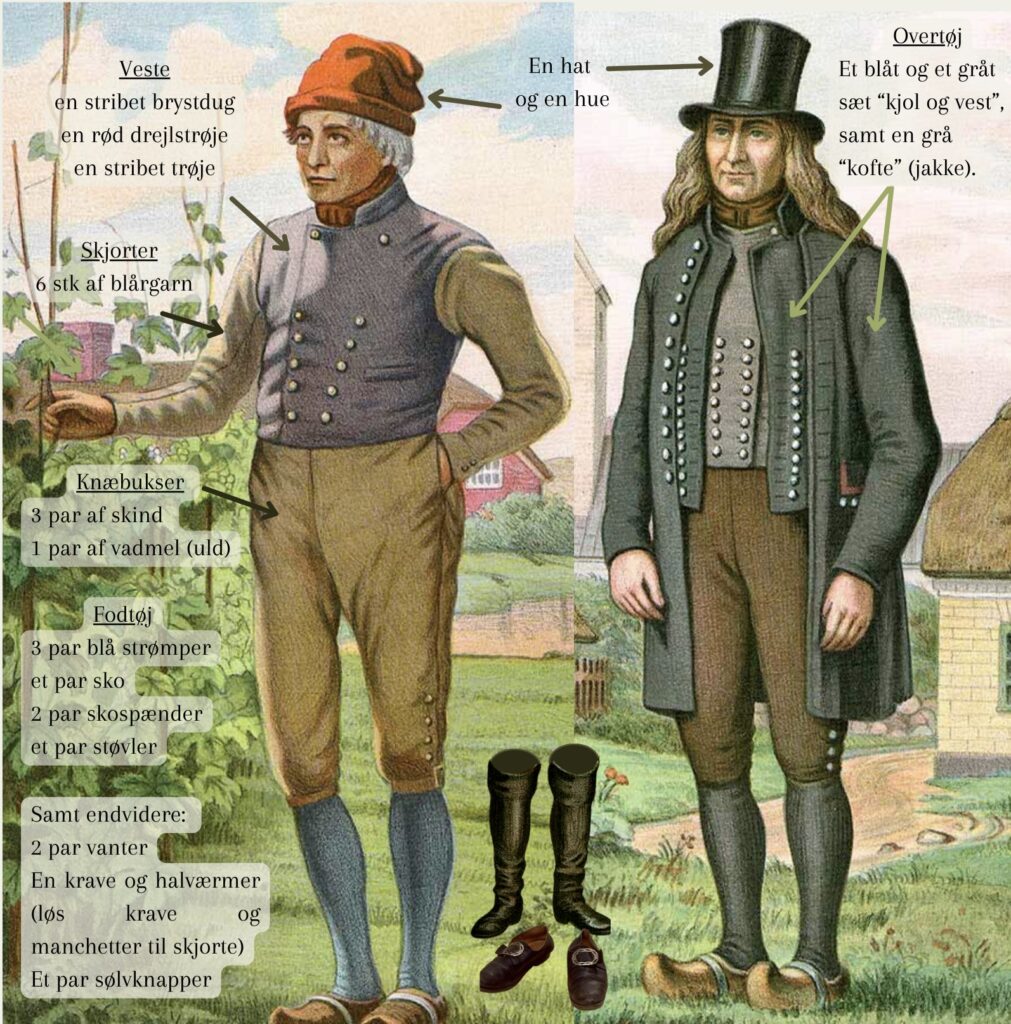 Niels efterlod sig også en fuld garderobe, og den blev også opgjort i skiftet. Da mange af dragtbetegnelserne i dag enten har ændret betydning eller ikke anvendes mere, har jeg angivet dem på billedet her til højre. Tegningerne stammer fra F. C. Lunds “Danske Nationaldragter”, som er malet i 1800-tallet, dvs. lidt senere end Niels levede, men plancherne er netop malet for at illustrere de traditionelle gamle klædedragter.