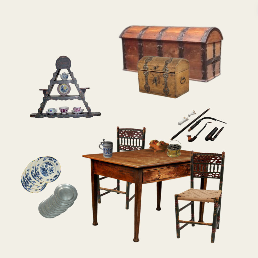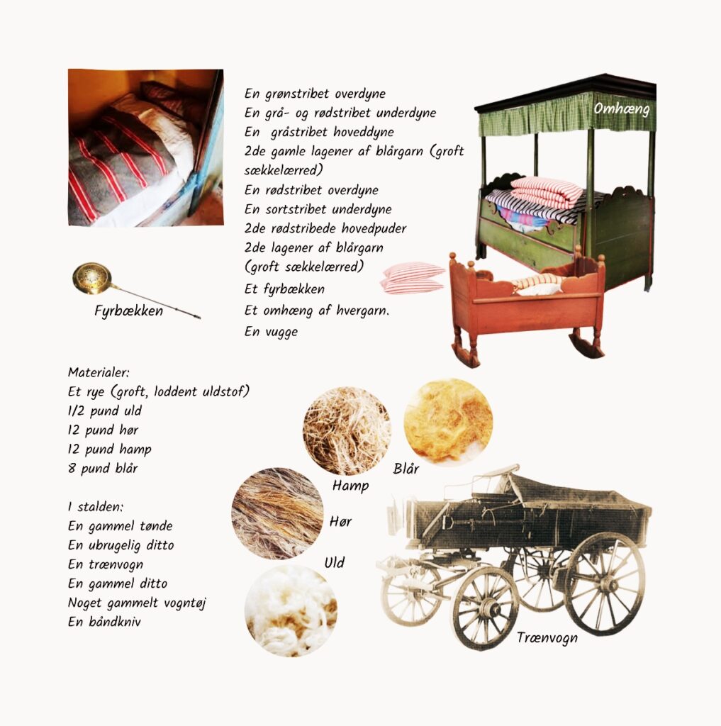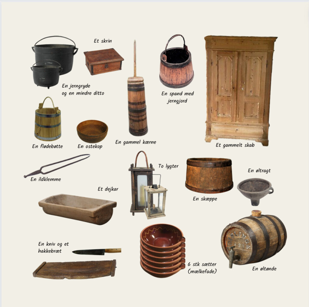 I stuen var der bord og halmstole og amagerhylde på væggen. Blandt Niels’ ejendele var også to piberør med sølvringe, en ildpande og et fyrfad. Ildpanden var en lav skål, som man satte ind på bordet med gløder i. Når man havde stoppet piben med tobak, tog man så enten med fingrene eller en lille tang en glød og lagde oven i piben, så man fik ild i tobakken. I køkkenet havde man både smørkærne, dejtrug og øltønde og i soveværelset fine, stribede olmerdugsdyner.