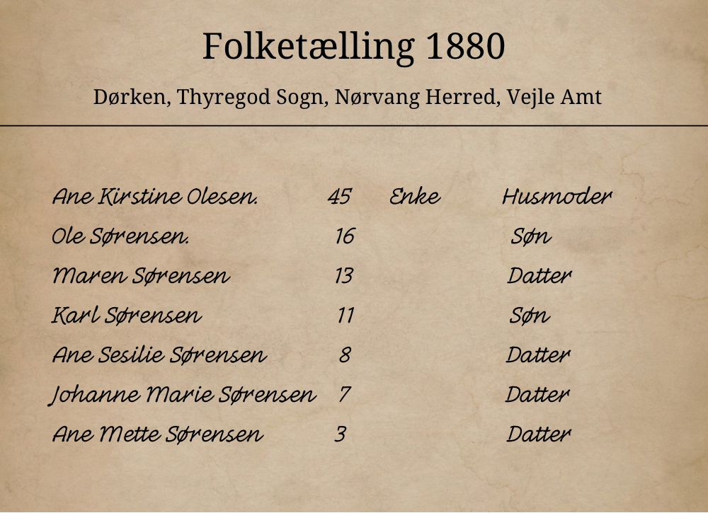 - 1880 – Folketælling, Dørken, Thyregod Sogn, Nørvang Herred, Vejle Amt.