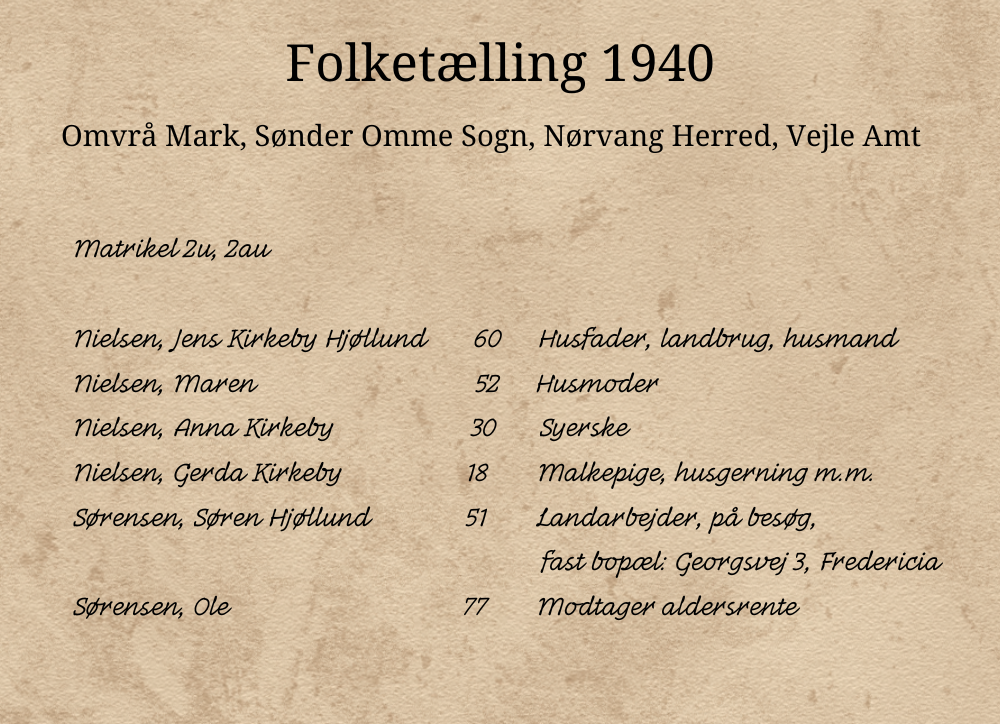 Herefter boede Ole fortsat hos Abelones søn, Jens Kirkeby. Vi kan se ham i deres husstand i folketællingen 1940, hvor hans søn, Søren Hjøllund Sørensen, er på besøg.