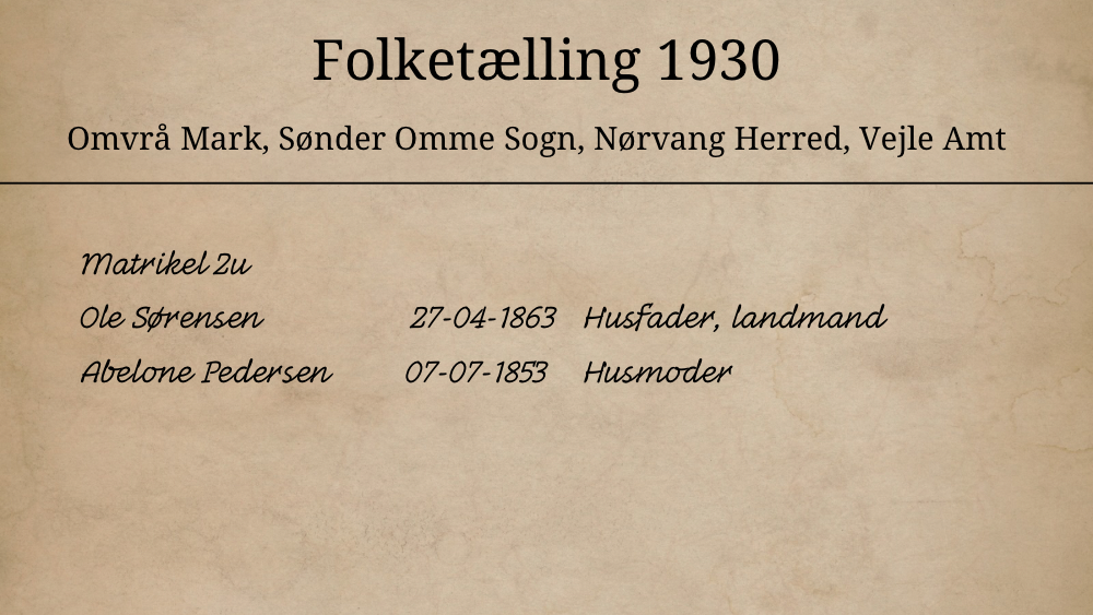 Ved folketællingen i 1930 boede Ole og Abelone stadig alene. De var nu hhv. 67 og 77 år gamle.