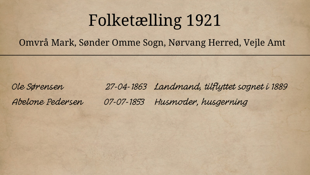 I næste folketælling 1921 var alle børnene flyttet og Ole og Abelone boede alene.